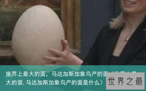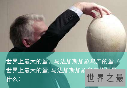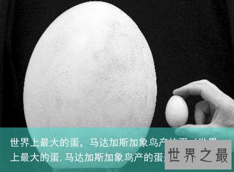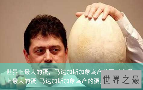 这个世界上最大的蛋是17世纪(400年前)已经灭绝的马达加斯加象鸟(Elephant Bird)产的蛋。这种象鸟有10英尺高,重达半吨,曾是世界上最大的鸟,这个世界上最大的蛋要比普通的鸡蛋大300倍,比已经发现的恐龙蛋都要大不少。它曾是英国肯特郡阿什福德的古董商约翰·什珀德收藏的藏品。什珀德得 知大卫·艾登堡在马达加斯加岛拍摄期间发现了一枚大象蛋后便出钱买了下来。这枚蛋原来里面有一只小雏鸟,但它被打破,然后再重新拼凑起来,所以现在它里面 是空的。