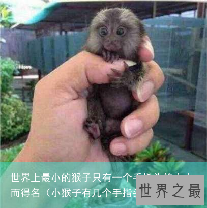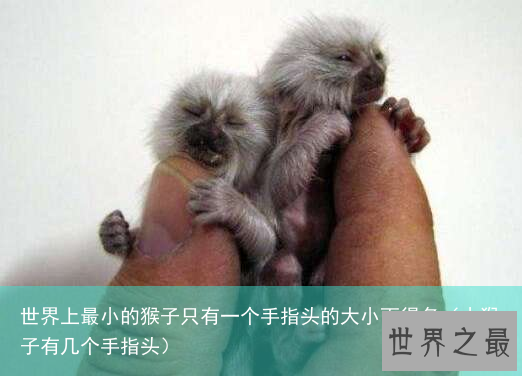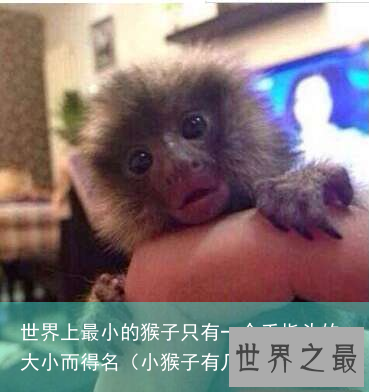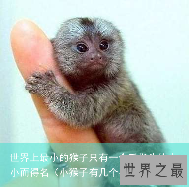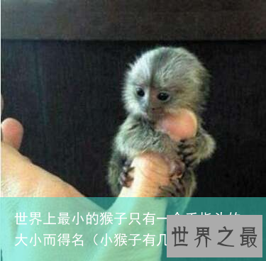 拇指猴(又叫狨猴)被称为世界上最小的猴子那是有证据的,成年的狨猴体长最多只有20cm,小一点就就只有10多厘米了,真得是和人的手指差不多长啊!体重也是轻的吓人,成年的拇指猴体重在重80—100克之间,连一斤重都没有,新生猴更是只有蚕豆般大小,重13克。这要比其他的猴子要小太多太多了。
