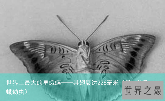 经蒋少芳考证,此蛾翅展达226毫米,比中国科学动物研究所昆虫图册第二号《蛾类图册》所记载的“两翅展开可达210毫米的大蚕蛾科”还大16毫米;比目前世界上发现最大的、出自加拿大的皇室巨凤蝶(翅展长近200毫米)还大26毫米;同时,此蛾翅展长度亦居于英国伦敦自然博物馆昆虫学家、英国国家馆藏全世界蛾类管理负责人大卫·卡特(DaridCarter)所著的《蝴蝶与蛾》中认定的,世界上整体尺寸最大的皇蛾(AtlasMoth)翅展159~300毫米的幅度之内,故此蛾堪称“世界之最”。