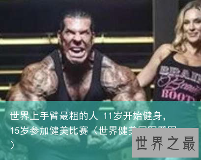 巨臂哥Rich Piana是世界上手臂最粗的人了,比世界上最强壮的人罗尼·库尔曼的手臂还要粗。他从11岁开始健身,15岁参加健美比赛。他每天都在健身从未间断过,只要看看他强壮的身躯,已经超过60cm的臂围。他受到很多,狂热的粉丝的喜爱,大家从来没有怀疑他用过类固醇激素药物,在这一点上他十分坦率,他表示自己从18岁开始注射类固醇。而且愿意为了他的梦想死去!