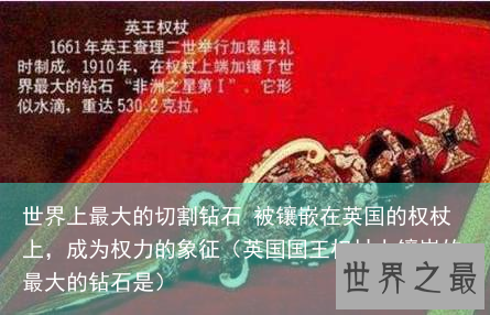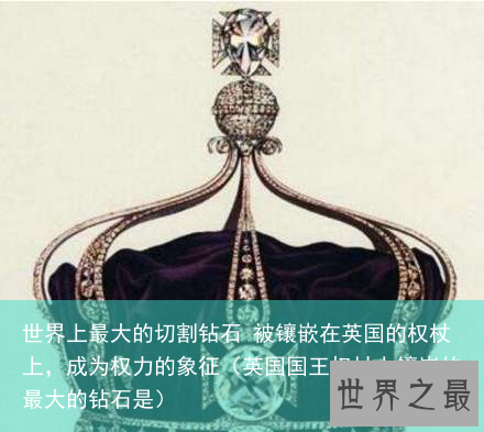 世上最大的钻石切割出来最大的一枚钻石是库利南一号,水滴样的形状(梨形),重量足足530.2克拉,这就是镶在英王的权杖上的那枚权力之钻!这粒巨钻还有一个响亮的名称“非洲之星”它在很长一段时间都是世界上最大的切割钻。每当英国国王举行重大仪式的时候,我们都可以看到这颗钻石的身影!这颗钻石有74个刻面,在阳光下散发着它独特的光彩!