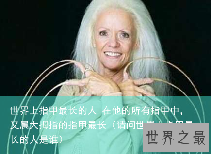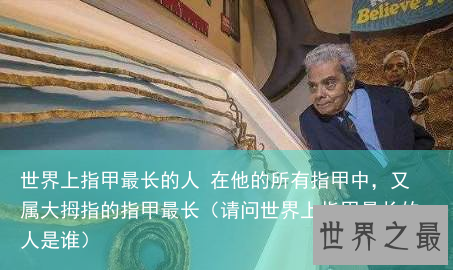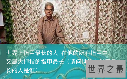 目前世界上最长的指甲拥有者是一位来自印度的老人,名叫什里达尔·奇拉尔,他的所有指甲加起来的总长度达到了9.1米(百科所说6.15米其实不太准确),并且还是单只手的指甲长度(他仅左手留有指甲),其记录也是被写入吉尼斯世界纪录之中,成为世界上指甲最长的人,此纪录也是一直没有被打破。