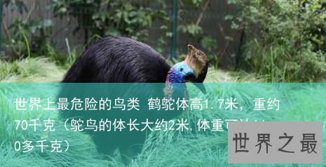澳大利亚的普通鹤鸵是最大的种类,体高几达1.5公尺(1.5米),喉部有2个红色长肉垂。能奔跑,善跳跃,性机警。鸣声粗如闷雷。性凶猛,常用锐利的内趾爪攻击天敌。所以说这个世界真的是处处都充满了危险,这些危险不一定全部来自人类,就像这种恐怖的鸟类的存在无时无刻不在威胁一些脆弱的生命。