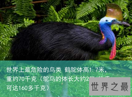 鹤鸵体高1.7米,重约70千克。中趾的爪就更像匕首,长120毫米。这爪特别危险,鹤鸵可以以时速50公里穿越密林,利用头上的骨盔推倒小树及丛林。利爪结合强有力的腿,鹤鸵能够将人类内脏钩出,而对付狗和马只需一击即可致命。这种鸟类感到受到威胁的时候就发起攻击,2007年,鹤鸵被吉尼斯世界纪录收录进“世界上最危险的鸟类”。