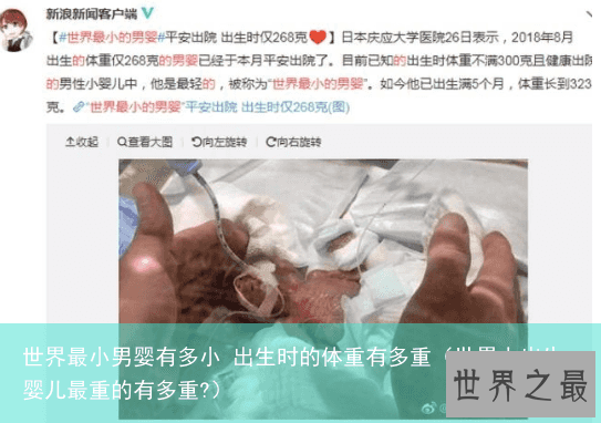 据美国爱荷华大学收集的各国医院数据显示,目前世界上出生时未满300克,且健康出院的婴儿有23人,其中男婴只有4人。此前世界最小的男婴2009年在德国出生,体重为274克。最小的女婴也于2015年在德国出生,体重为252克。