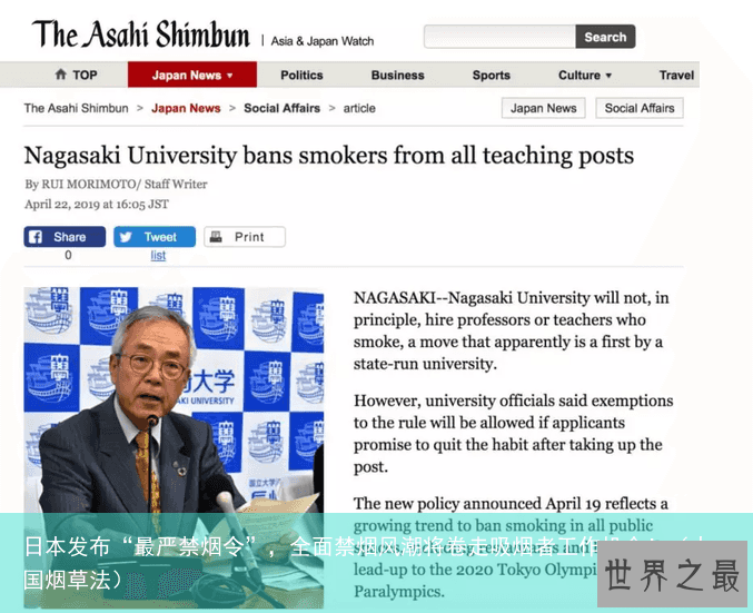 长崎大学校长Shigeru Kono表示,“我们作为一所大学的工作是培养人力资源,我们觉得有必要阻止人们吸烟,因为一些公司已经开始不招聘吸烟者。”