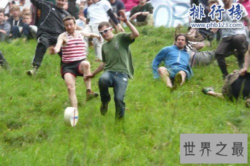 法官在斜坡上滚动了一轮奶酪,参与者跟随。人们试图沿着斜坡跑下去,但可以预见的最终会像奶酪一样滚动或滑落,很多人会因为这场运动受伤。