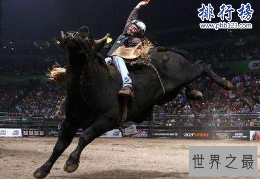 骑牛是在包括美国、危地马拉、加拿大等国家非常受欢迎的运动,这场运动的最大风险在于骑手必须在公牛背上持续8秒,大多数人都会在中途掉落,甚至于被公牛所伤。此外不仅是骑手危险,观众也是比较危险的。