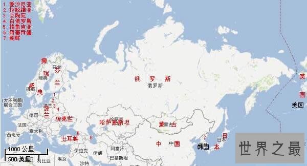 海陆领国(8个):挪威、芬兰、爱沙尼亚、乌克兰、格鲁吉亚、立陶宛、朝鲜、波兰。
