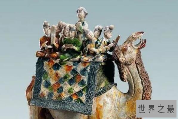 国家级文物三彩载乐骆驼俑为三彩技乐俑中的罕见珍品。它通高58厘米,长41厘米。它凝固的瞬间,令人遐想无限。乐俑所持乐器基本出自西域,而演奏及舞蹈者皆为汉人。虽说历经了千年时间,器物露胎处已有风化现象,但交错的红、绿、白三色之间仍闪耀着昔日的光辉,它以其独特的人文魅力吸引着众多游人驻足欣赏。