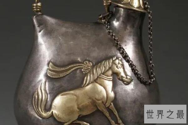 鎏金舞马衔杯银壶,盛唐著名银器,出土在陕西西安南郊何家村唐代窑藏通高18.5厘米。这件仿皮囊形银壶整体造型仿照骑马的游牧民族储水用的皮囊,上口敛而底部呈扁弧形,周身看不到焊缝。器腹两面均锤出一马衔杯纹,马颈系飘带,昂首扬尾,似作舞状。纹饰鎏金。形制优美,图案别致,制作精工。圈足内有墨书一行:“十三两半”,标示了该壶的重量。