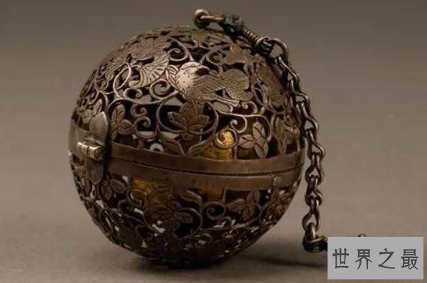 唐葡萄花鸟纹银香囊为唐朝的文物,1970年窖藏出土于陕西省西安市南郊何家村。这个外径4.6厘米,金香盂直径2.8厘米,链长7.5厘米,香囊外壁用银制,呈圆球形,整体镂空,以中部水平线为界平均分割形成两个半球形,上下球体之间,一侧以钩链相勾合侧以活轴相套合,下部球体内又设两层银制的双轴相连的同心圆机环;唐葡萄花鸟纹银香囊作燃放固体香料之用。