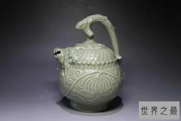 青釉提梁倒灌壶为五代时期的文物,出土于陕西省彬县,高18.3厘米, 腹径14.3 厘米, 足径8.7厘米。壶盖与器身连为一体。凤凰作提梁,狮子当流,想象丰富,神态生动。腹部满刻四朵盛开的缠枝牡丹花,刀法犀利圆润,装饰效果浓郁。梅花形注水口设于壶底中央,壶内有漏柱与水相隔,灌水时将壶倒置,待盛满后,将壶放正,滴水不漏,是“倒而不漏”的神奇国瓷。釉面莹润,造型独特,构图严谨,图案精美,是耀州窑的代表作品。