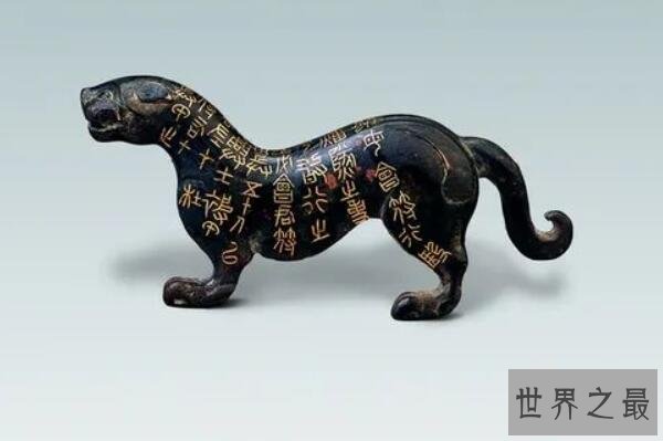 杜虎符是战国晚期秦国兵符,中国最早的兵符于1975年出土于陕西省西安市的陕西历史博物馆的镇馆之宝之一。杜虎符属青铜质,虎形,昂首、塌腰、垂尾,颈部有一穿孔,背面有一凹槽。全符由左右两半合成,发现的仅左半符,身长9.5厘米、高4.4厘米、厚0.7厘米。符面有错金铭文九行四十字“兵甲之符。右才(在)君,左在杜。凡兴士被甲,用兵五十人以上,必会君符,乃敢行之。燔燧之事,虽母(毋)会符,行殴。”
