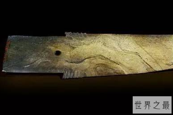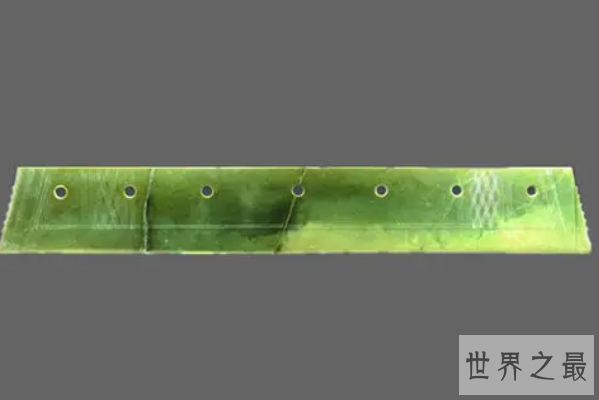 这个夏朝玉器于1975年出土于河南偃师二里头遗址中,现收藏于洛阳博物馆中。扁平的玉刀长65厘米,最厚0.4厘米。玉料呈墨绿色,局部有黄色沁。这柄被列入中国10件禁止出国展览的国宝级玉器的玉刀,出土丰富了二里头文化的内涵,为进一步探索夏文化提供了可靠的实物例证。