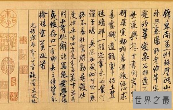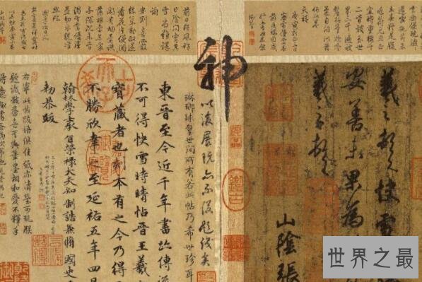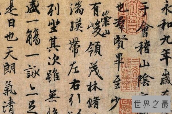 这幅有着天下第一行书美称的书法作品,是由书法家王羲之创作于永和九年三月初会稽山阴的长72厘米,宽232厘米的序文手稿,后来唐太宗还将其推送为尽善尽美,据传还将其真迹殉葬。