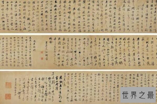 这个目前收藏在中国台北故宫博物馆中的纸本墨迹草书书法作品,是由唐代著名书法家怀素于唐大历十一年或十二年创作的长28.3厘米,宽775厘米,有着天下第一行书美誉的在书法领域中营养深远的作品。