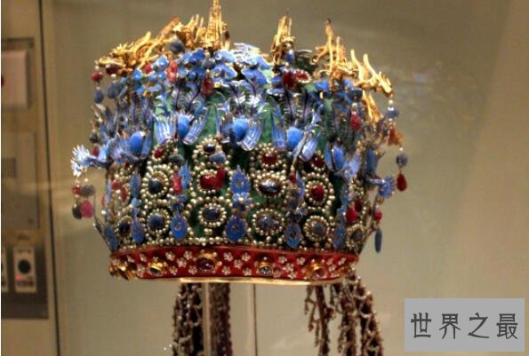 这个于1957年在明定陵地宫中出土的孝端皇后凤冠,这个高48.52厘米,重2320克的凤冠因前部有九条金龙,下部饰有8只点翠金凤,后部也有一金凤而得名,这个凤冠上海整体镶嵌有115块红宝石和4414颗珍珠,整体显得富丽堂皇,利用翠鸟羽毛制作的点翠还富有艳丽富有光泽的色彩。