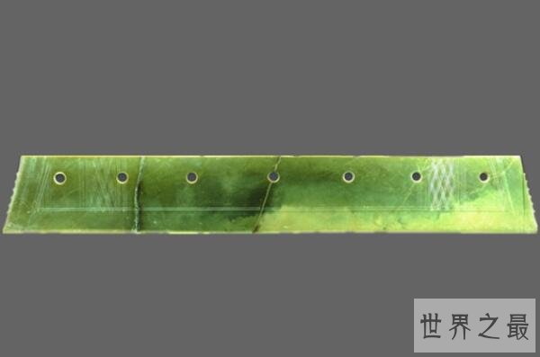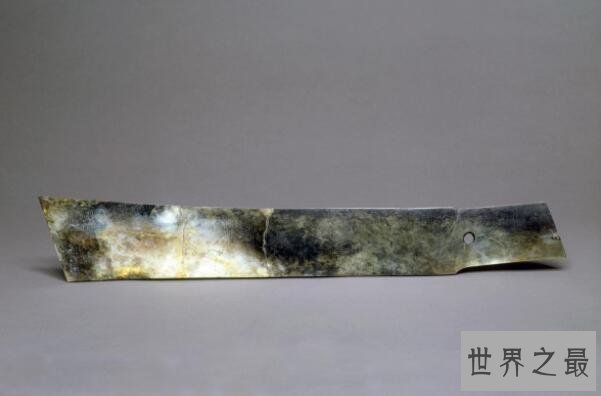 这把于1975年出土在河南偃师二里头遗址的夏朝玉器,目前收藏在洛阳博物馆中,这把玉器两面纹饰相似,并等距排有七个光滑圆润的圆穿孔,这把有着精美纹饰的玉器对研究中国玉器发展史和夏文化有着不可估量的研究价值。