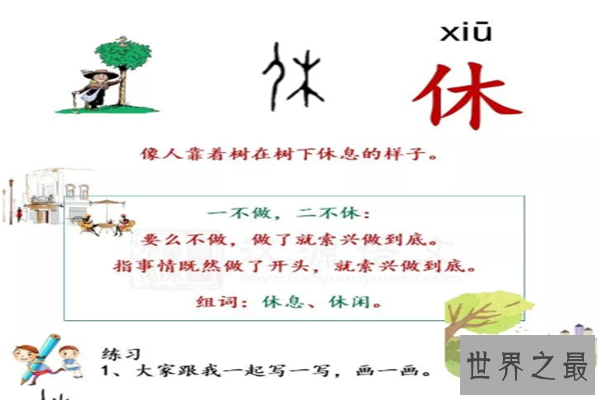 休,这是一个会意字,我们可以把这个字拆分成两个部分,左边一个人,右边一个树,一个人靠在一棵大树边,这是一种休息的状态,所以就有了“休”这个字,简单又通俗。