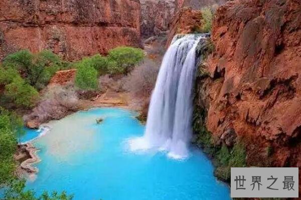 哈瓦苏瀑布是北美第一大瀑布,以其变化多端的容貌而著名,蓝色瀑布沿着红色的岩石倾泻而下,看起来非常超凡脱俗。