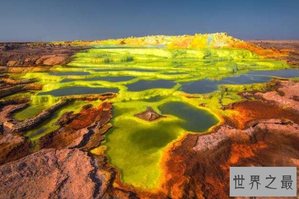 达纳基尔洼地又叫阿尔法洼地,位于非洲埃塞俄比亚北部,是地球上最热的地方之一,最高温度达49度,但令人不可思议的是这里的温泉和岩石都有着很美丽的色彩。