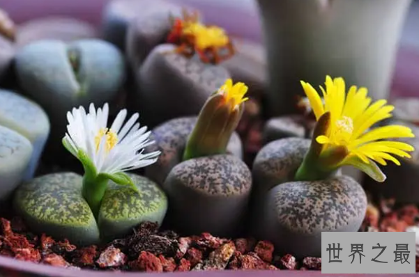 生石花作为世界上十大植物之一,它的形状和卵石非常像,叶子非常肥厚能够储存大量的水分,能开出好看的金黄色花朵,不过非常短暂,一天就凋谢了。石生花长成石头的样子主要是为了躲避动物,避免被吃掉。
