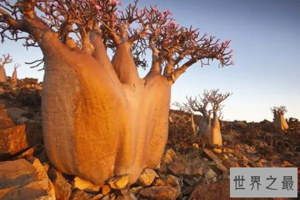 纺锤树生长在南美洲的巴西高原上,远远望去很像一个个巨型的纺锤插在地里,树最高有30米,最粗的地方直径达到5米,在雨季是能吸收2吨的水分,储存起来,供自己的消耗,所以在缺水的时候可以找这种树解渴。