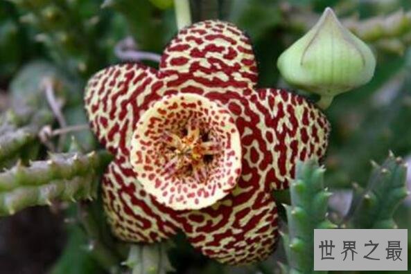 豹皮花原产于非洲热带地区,其花朵呈五角形,上面的纹路也非常奇特,和豹皮上的花纹相似,但它也被称为臭肉花,开花时会散发出一种难闻的味道,还会吸引苍蝇,所以也不适合家养。
