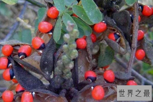 非洲相思子是主要分布于热带非洲的一种剧毒植物,在春夏季节开花,开出的花呈淡紫色或白色,种子呈鲜艳的红色,其种子中含有剧毒,误食极有可能丧命。