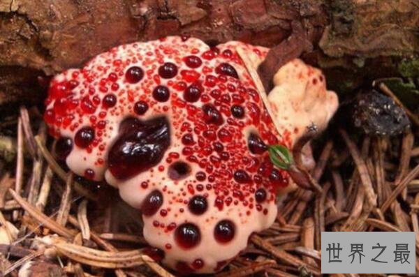 血齿菌被称之为“恶魔牙齿”或者“草莓加奶油”,是全球十大毒蘑菇之一,血牙真菌还有许多不同的名字,都和橘子或者血有关。这种真菌常见于美国,尤其是西北太平洋地区,也是通常生长在松树林中。它也被发现存在于欧洲,最近又在伊朗和韩国被发现。刚一看到,你会以为它的菌盖上面鲜红色的液体是哪个可怜的动物路过时溅在它白色的菌盖上的。但观察的仔细一些,你就会发现,这是从它自己的气孔中渗出的液体。