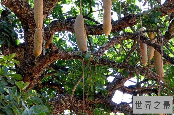 香肠树主要生长在非洲的草原上,因长出的果实又粗又长,就如同挂在树上的一根根香肠而得名,一根“香肠”可以有10斤重,虽然长得很像香肠,但吃起来却是甜甜的味道。