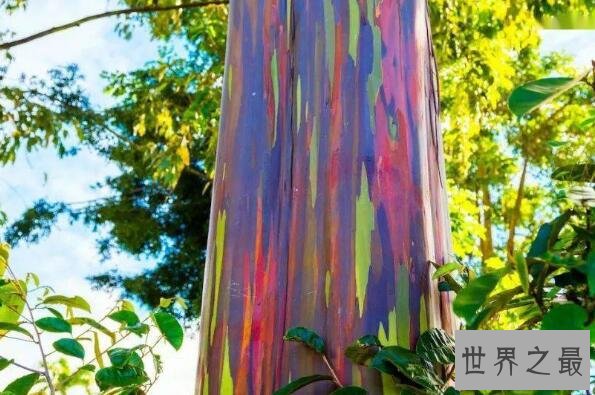 彩虹桉树是北半球的唯一一种桉树,也是全球十大罕见大树之一,其树高可达70米,树皮上的颜色非常丰富多样,有黄色、绿色、橙色以及紫色等等,就如同彩虹一般,所以得名彩虹桉树。