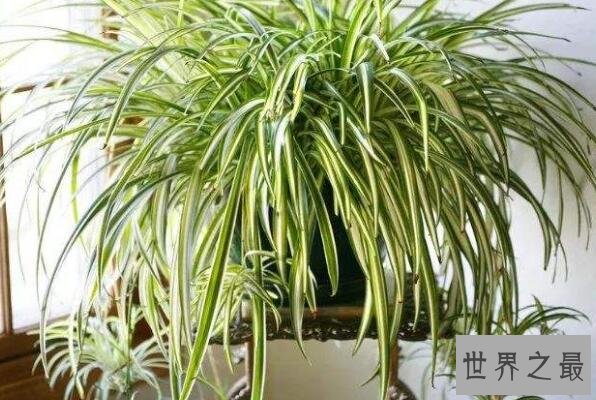 吊兰是原产于非洲南部的一种草本植物,其叶形细长,和兰花的形态相似,叶片中间还会有黄色或绿色的条纹,开出的花也非常漂亮,具有高的观赏价值,而且吊兰具有极强的净化空气能力,被称为“空气卫士”。