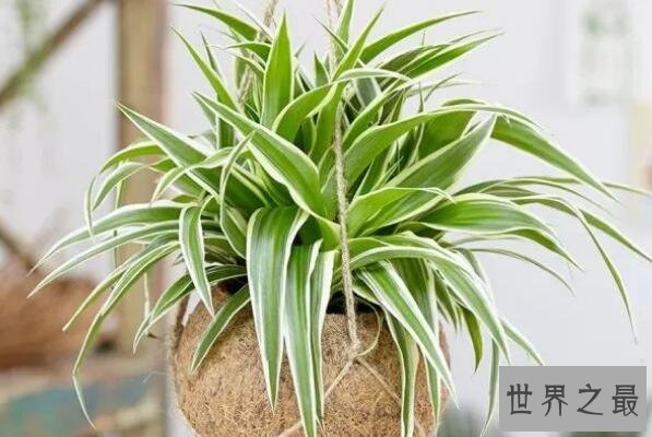 吊兰也是原产于南非的一种观赏植物,其叶片形状细长,和兰花非常相似,叶片中间还会有黄色或者绿色的条纹,开出的花呈白色,而且吊兰具有极强的净化空气作用,被称为空气卫士。